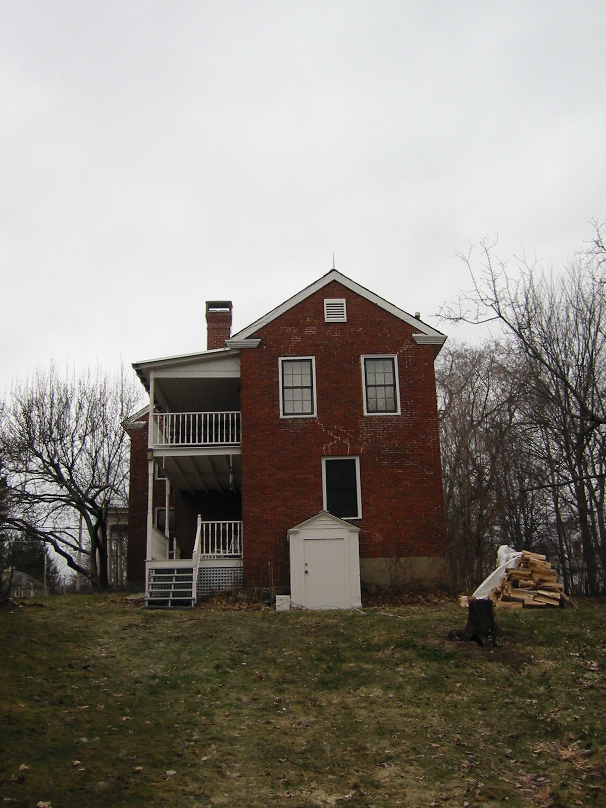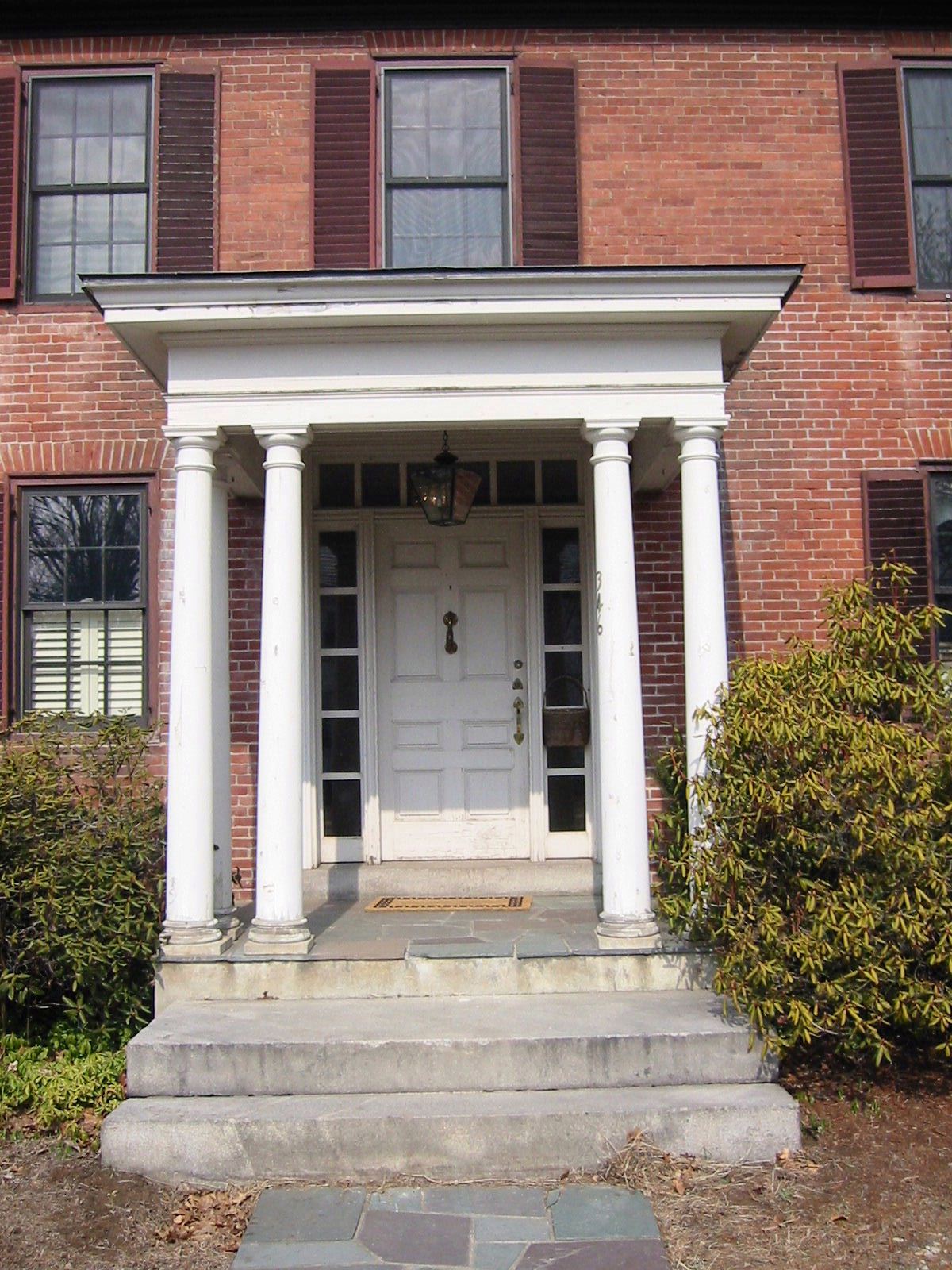 The south side with shutters removed. I installed a Knox box, visible to the left of the door, and my new industrial-strength mailbox while the painting was going on. |